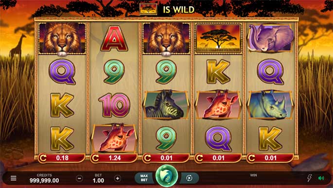 Trò chơi mang chủ đề chuyến đi săn trong thiên nhiên với các biểu tượng tượng trưng cho động vật như sư tử, voi, hươu cao cổ, tê giác và ngựa vằn, kèm theo những biểu tượng lá bài đi kèm phong cách hoang dã.